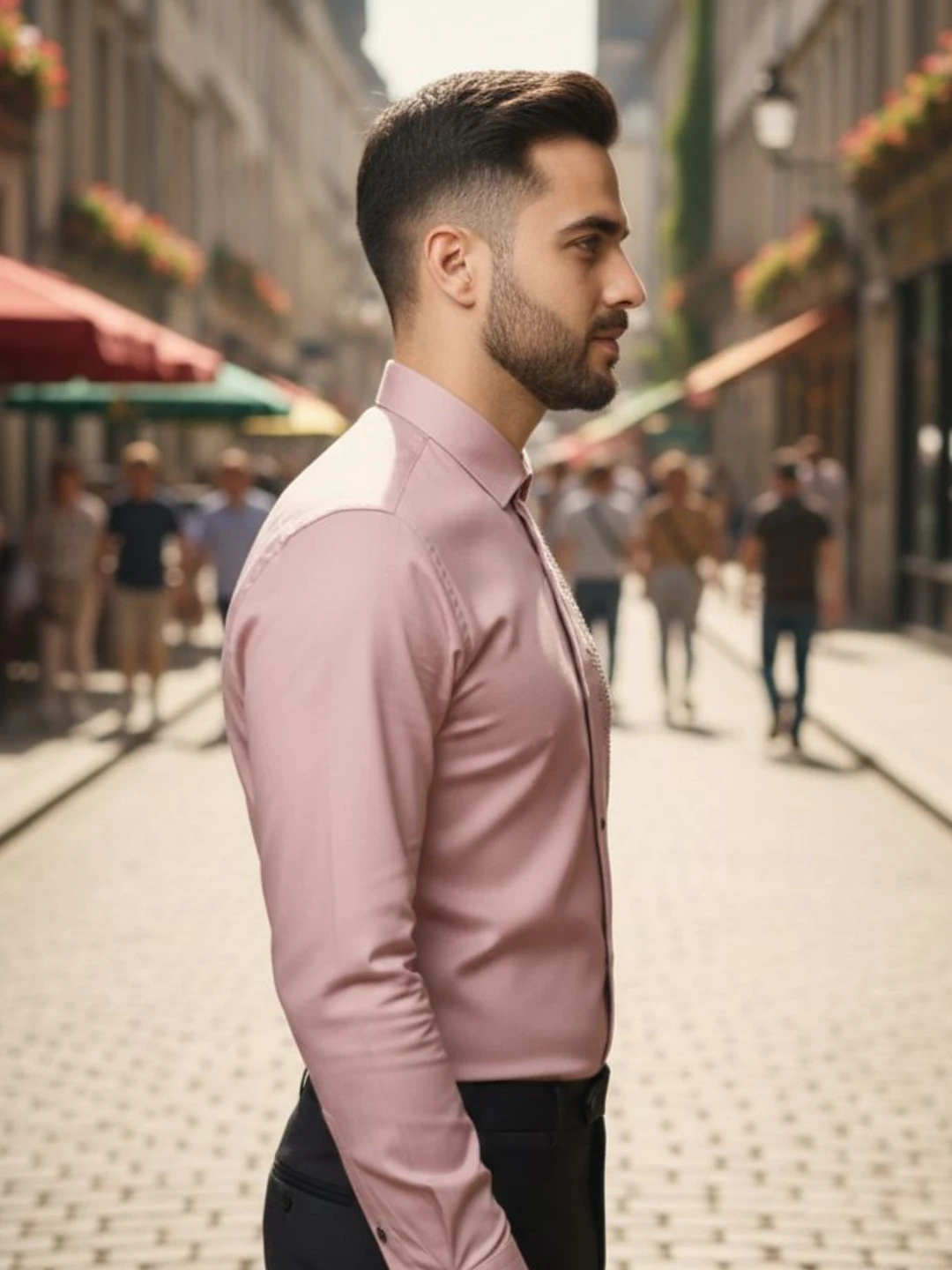 Upgrade your style with this premium light pink designer shirt, crafted for the modern gentleman who appreciates subtle luxury. Featuring a sleek tailored fit, this shirt stands out with its refined crystal-style embellishment on the chest, adding a touch of sophistication without being overpowering.