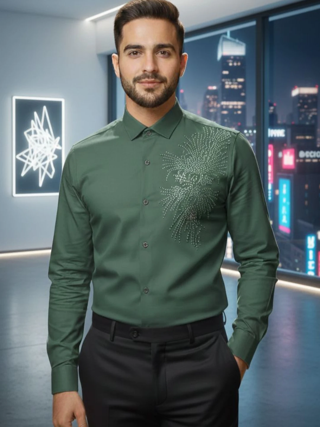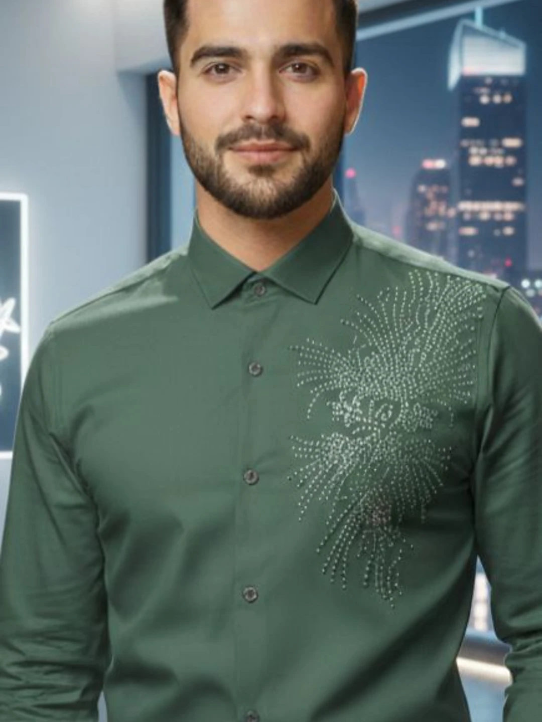 Make a bold yet refined style statement with this premium dark green designer shirt, crafted for men who appreciate modern luxury. Designed in a sharp tailored fit, the shirt features elegant crystal-style detailing on the chest, adding a distinctive touch of sophistication and glamour.