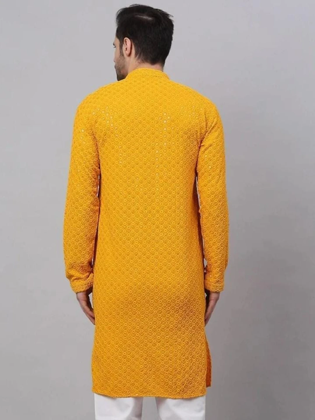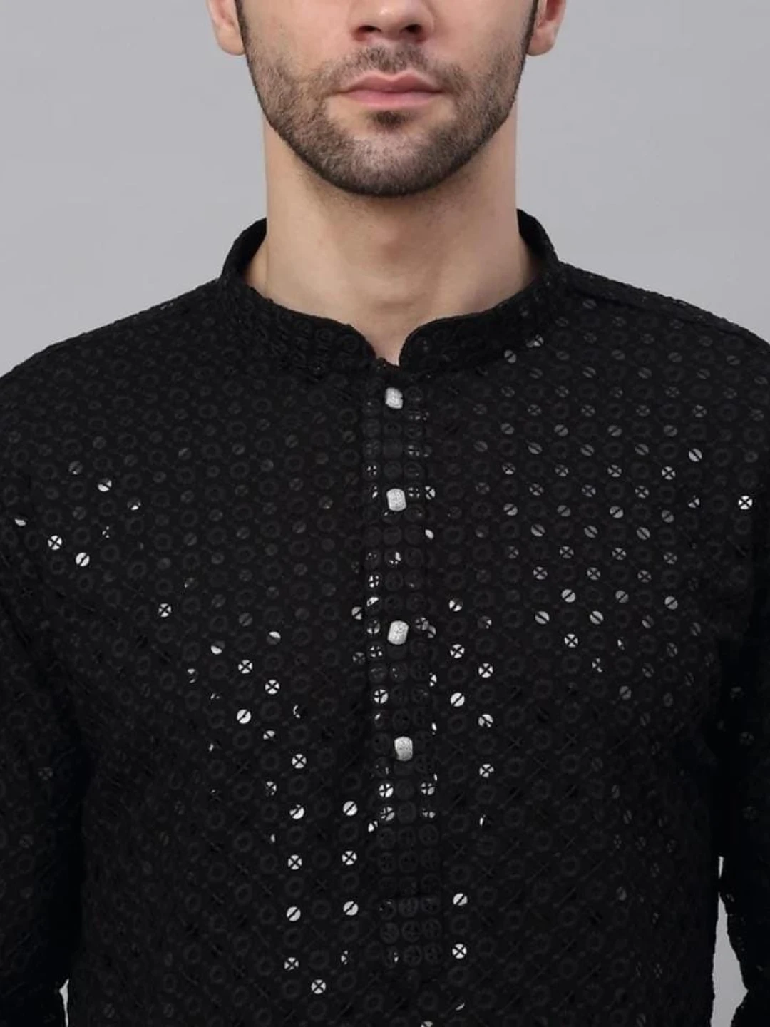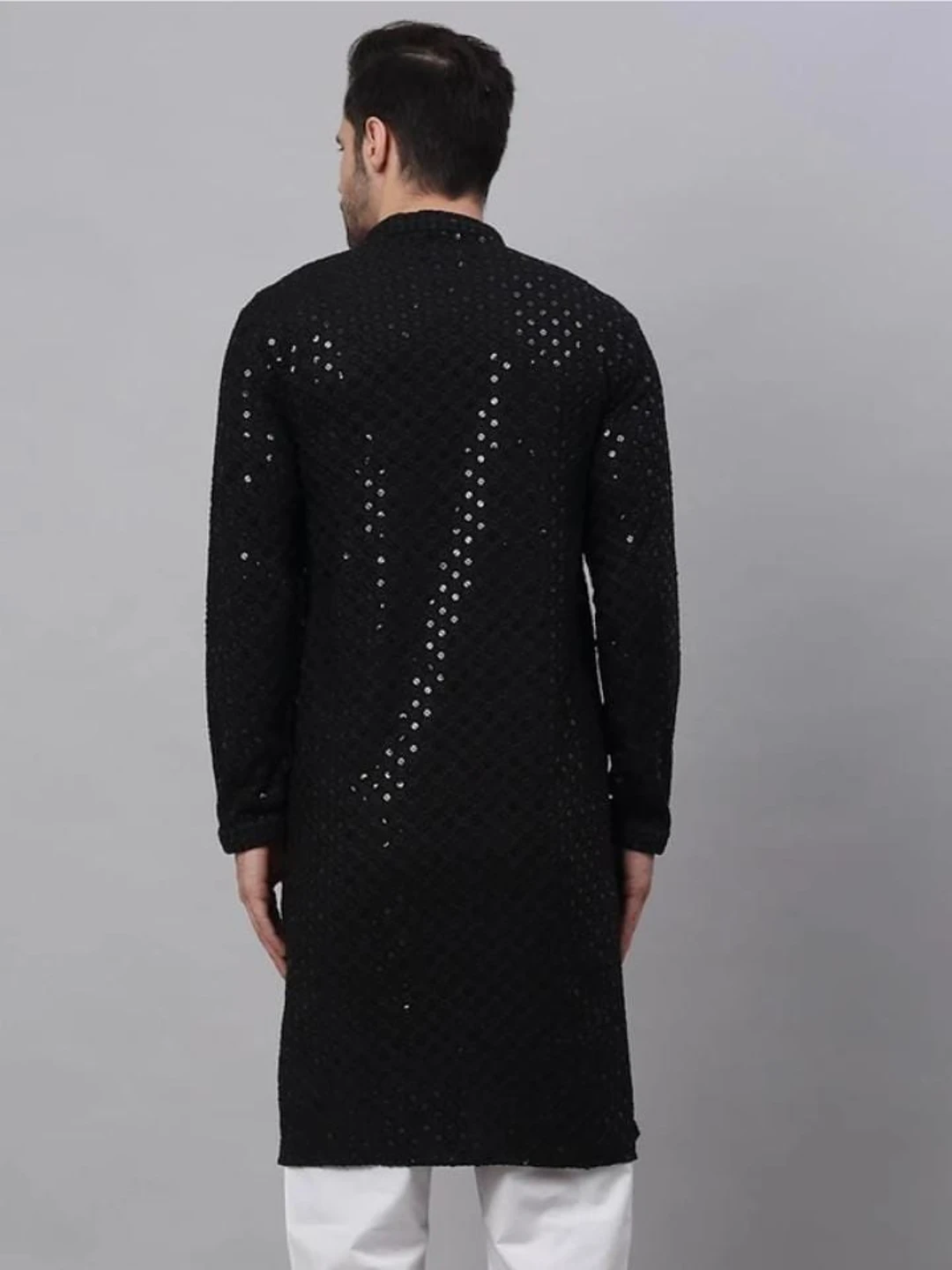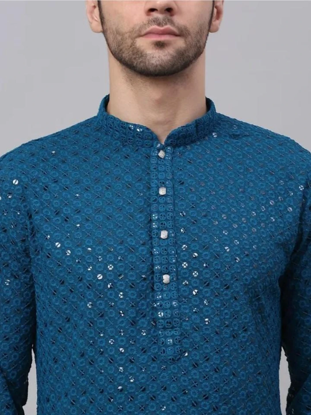 Step up your style game with this royal peacock blue chikankari kurta,jazzed up with sequins.This kurta is the perfect blend of elegence and dapper vibes,Making ye center of attention.