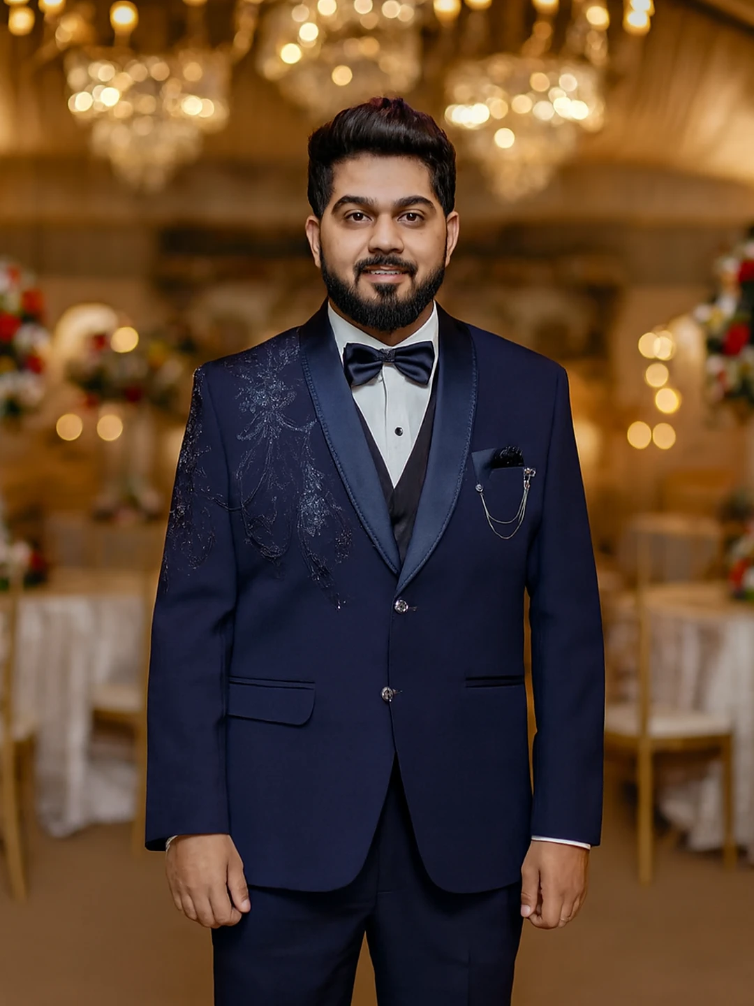 Crafted in deep navy with exquisite floral embroidery and satin lapels, this ceremonial piece blends tradition with modern sophistication. Styled with tailored trousers, a crisp white shirt, and statement accessories like the striped pocket square and floral brooch chain, it’s the perfect ensemble for grooms and wedding guests who want to stand out.
