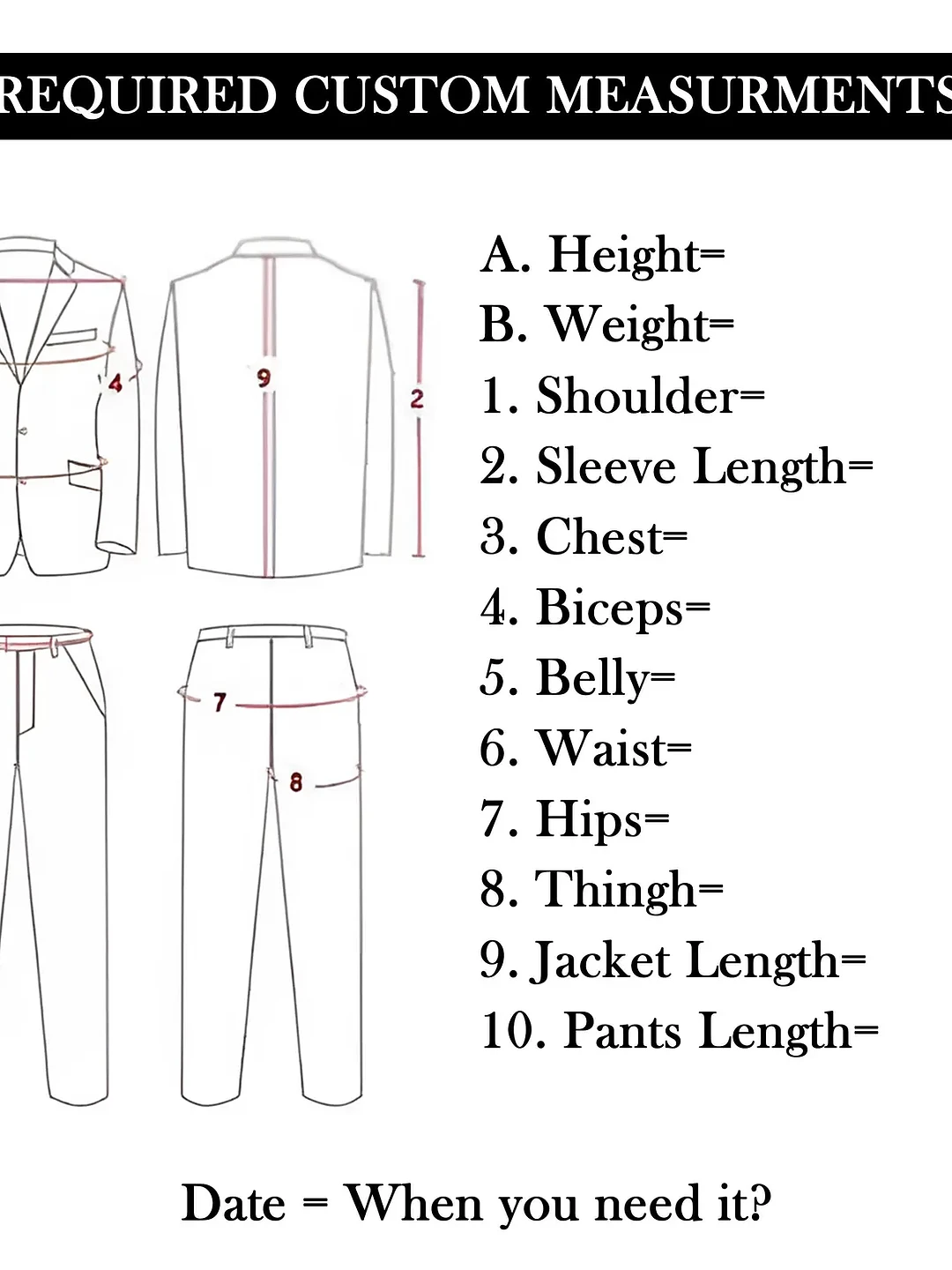 Customization available—just send us your measurements (in inches: Chest, Stomach, Waist, Hip, Shoulder, Height, Trouser Length, and Vest Length) after ordering.