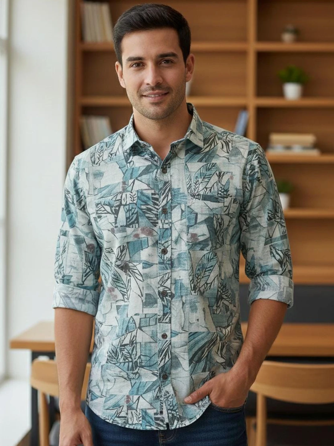 Featuring a unique blend of geometric shapes and leaf-inspired patterns in layered shades of teal, blue, and soft gray, this shirt delivers a contemporary look that stands out without overpowering your style.