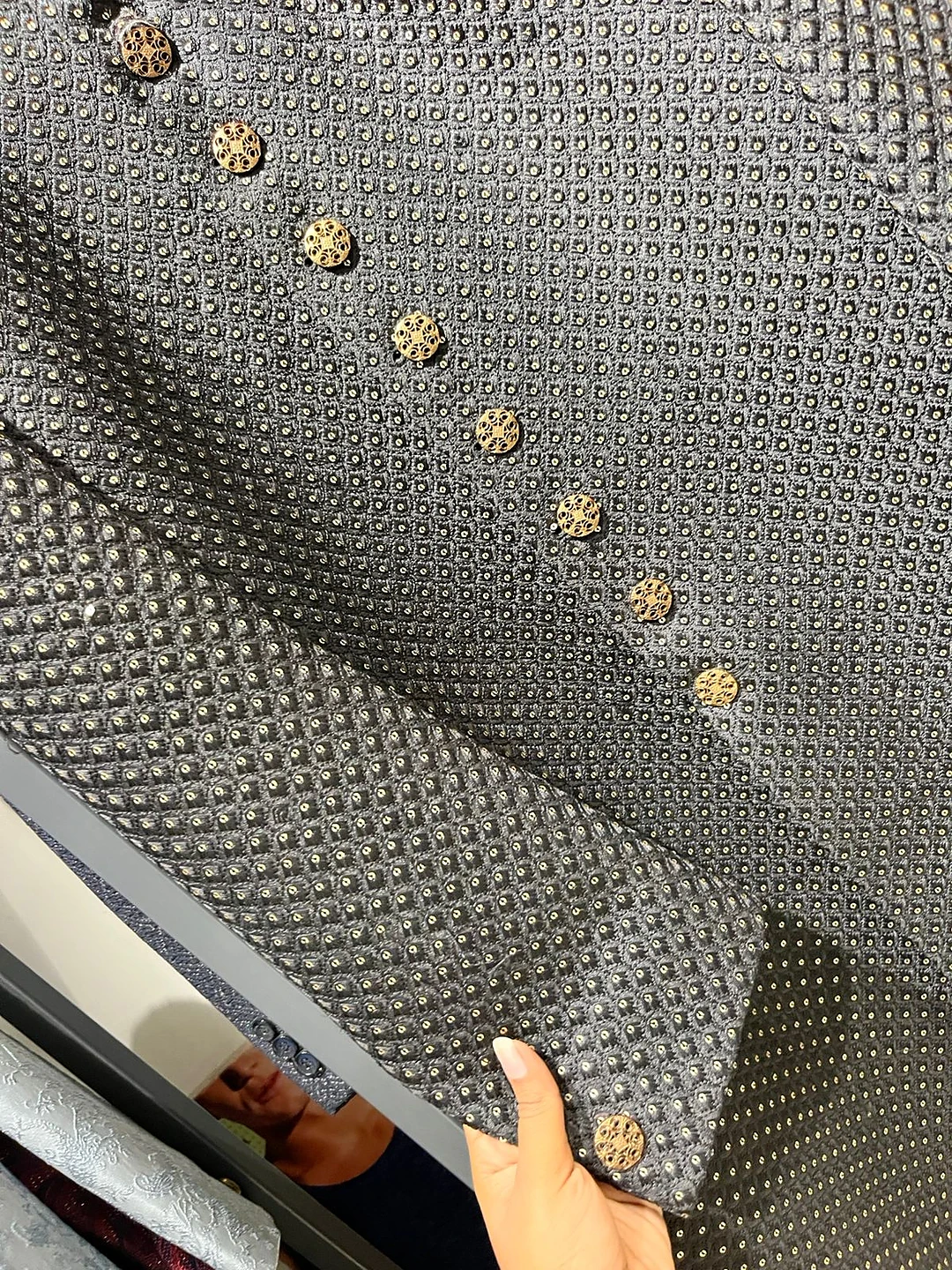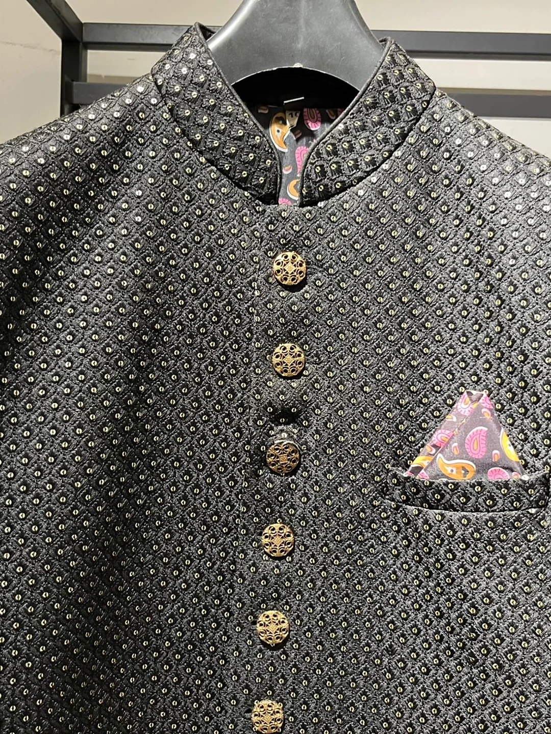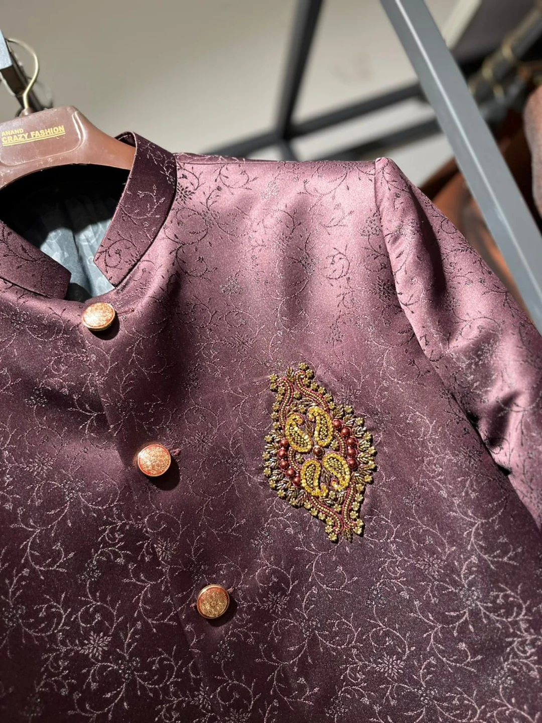 Maroon solid sherwani with gold-toned solid dhoti pant,Maroon solid sherwani, has a mandarin collar, a stylized curved button placket, long sleeves, a welt pocket, straight hem, side slits, an attached lining. Comes with a pocket square, Angrakha Style