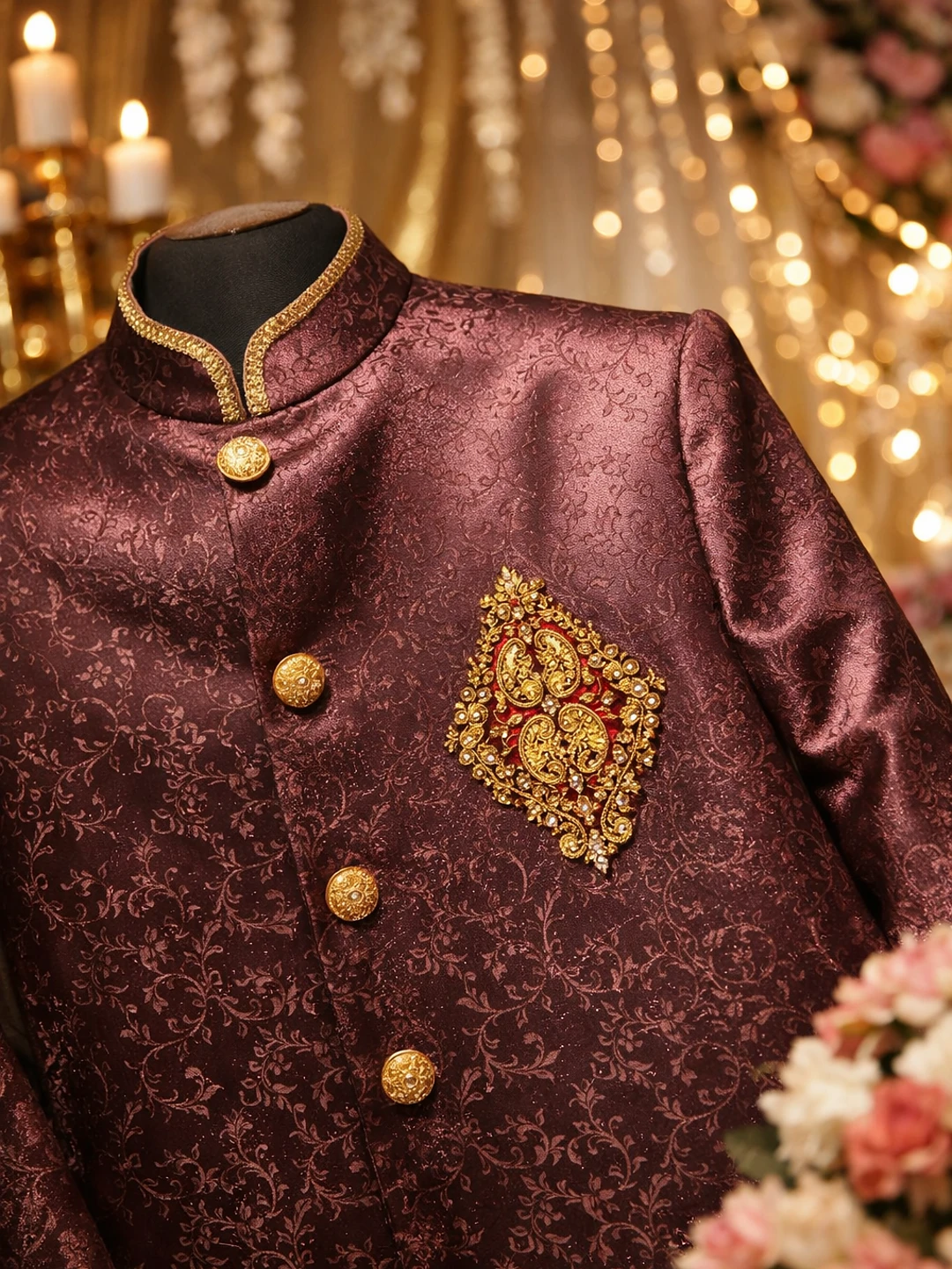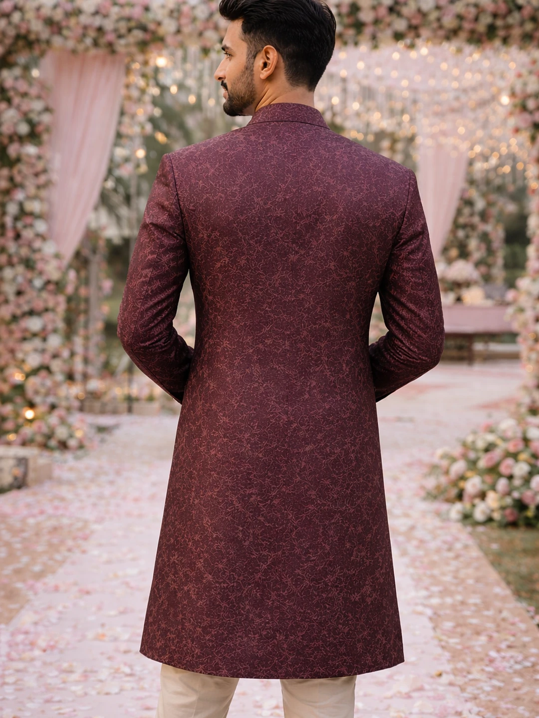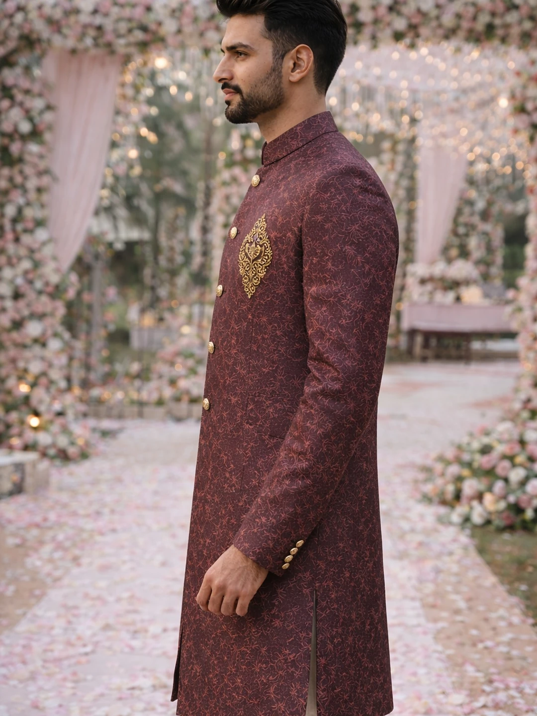 This sherwani features a rich deep maroon base that gives it a royal and elegant wedding look. The fabric appears to be premium silk or jacquard, decorated with delicate self-woven floral patterns spread evenly across the surface, adding a subtle yet luxurious texture. The front is designed with a classic mandarin collar and round metallic gold buttons that enhance its regal appeal. A beautifully embroidered golden motif on the chest adds a traditional touch, making it perfect for groom or festive wedding wear. Overall, the sherwani combines heritage craftsmanship with a sophisticated, royal finish ideal for weddings and grand celebrations.